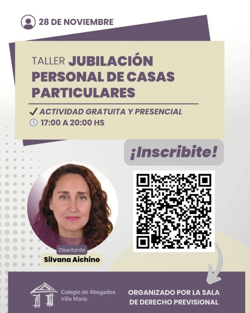 El Colegio de Abogados de Villa María invita a abogadas y abogados a participar del taller “Jubilación del Personal de Casas Particulares”, un espacio clave para actualizar criterios y profundizar en la práctica previsional.